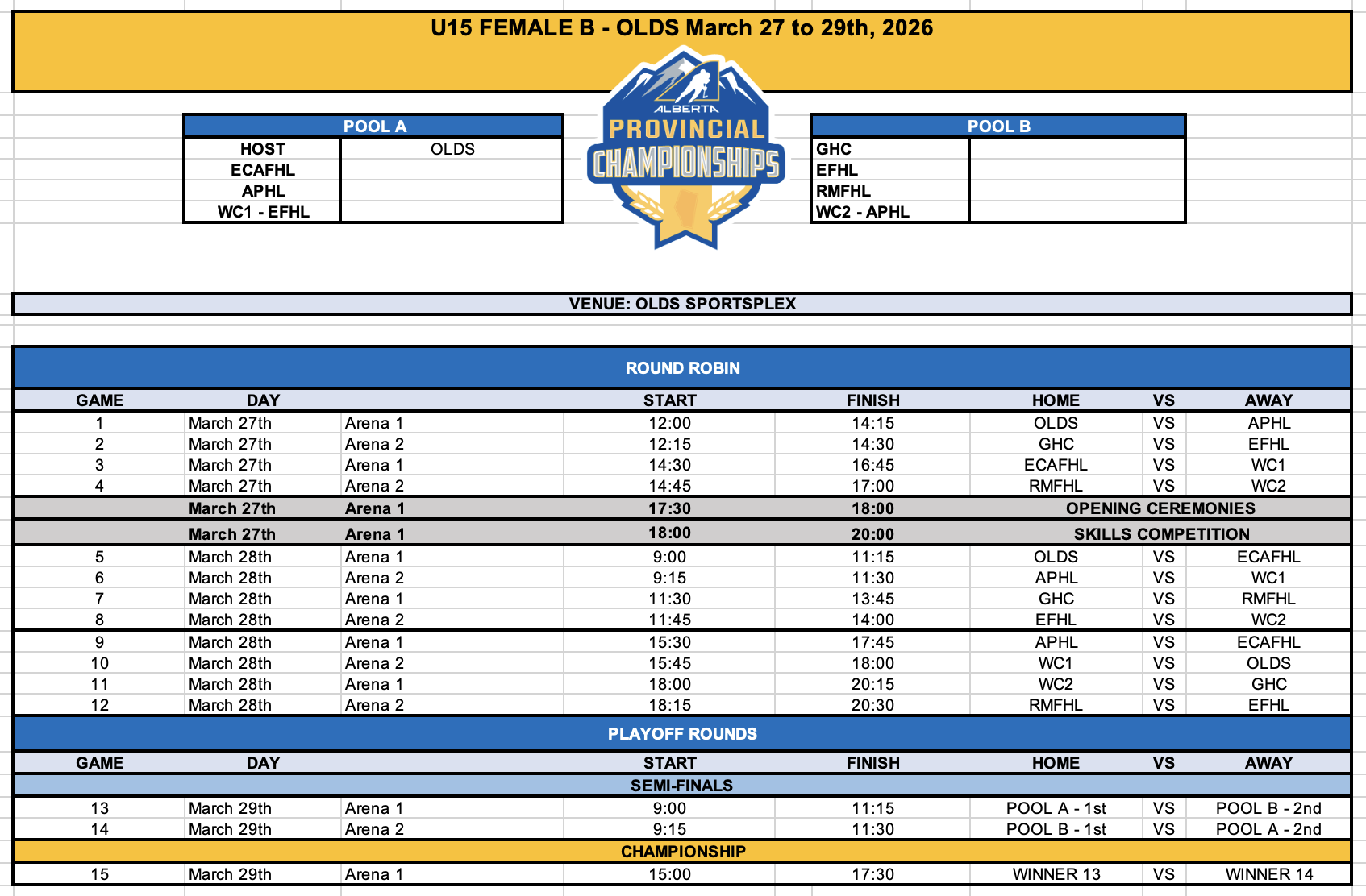 Friday, March 27th - 5:30 to 8:00 p.m. OPENING CEREMONIES & SKILLS COMPETITION @ Olds Sportsplex - Details will be sent to managers one week prior.
